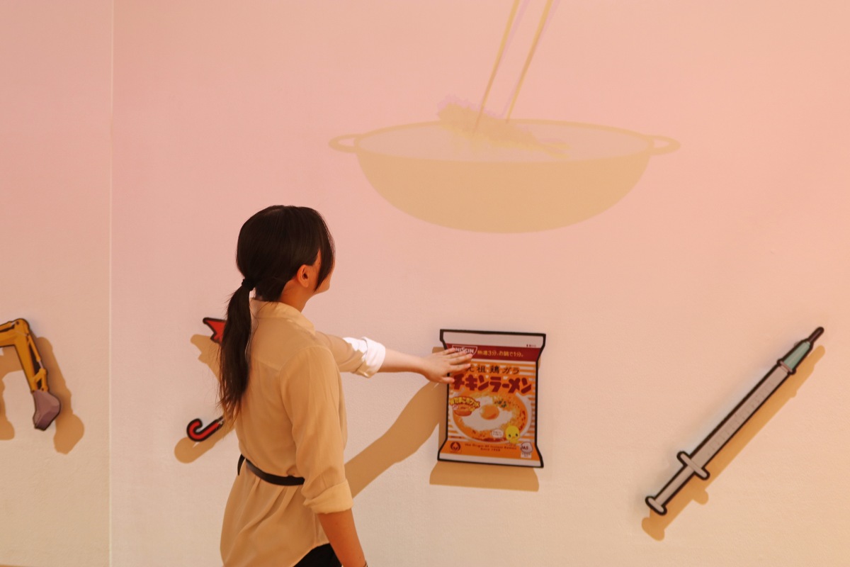 「クリエイティブシンキング ボックス」では、安藤氏のクリエイティブな発想を知ることができる6つのボックスが配置されています。こちらは「なんでもヒントにする」のコーナー。パネルに触れると、発明のヒントとなったものが変化して新しい発明に生まれ変わっていく様子が一目でわかる仕組みです。「チキンラーメン」は天ぷらの調理風景がヒントとなってつくられました。