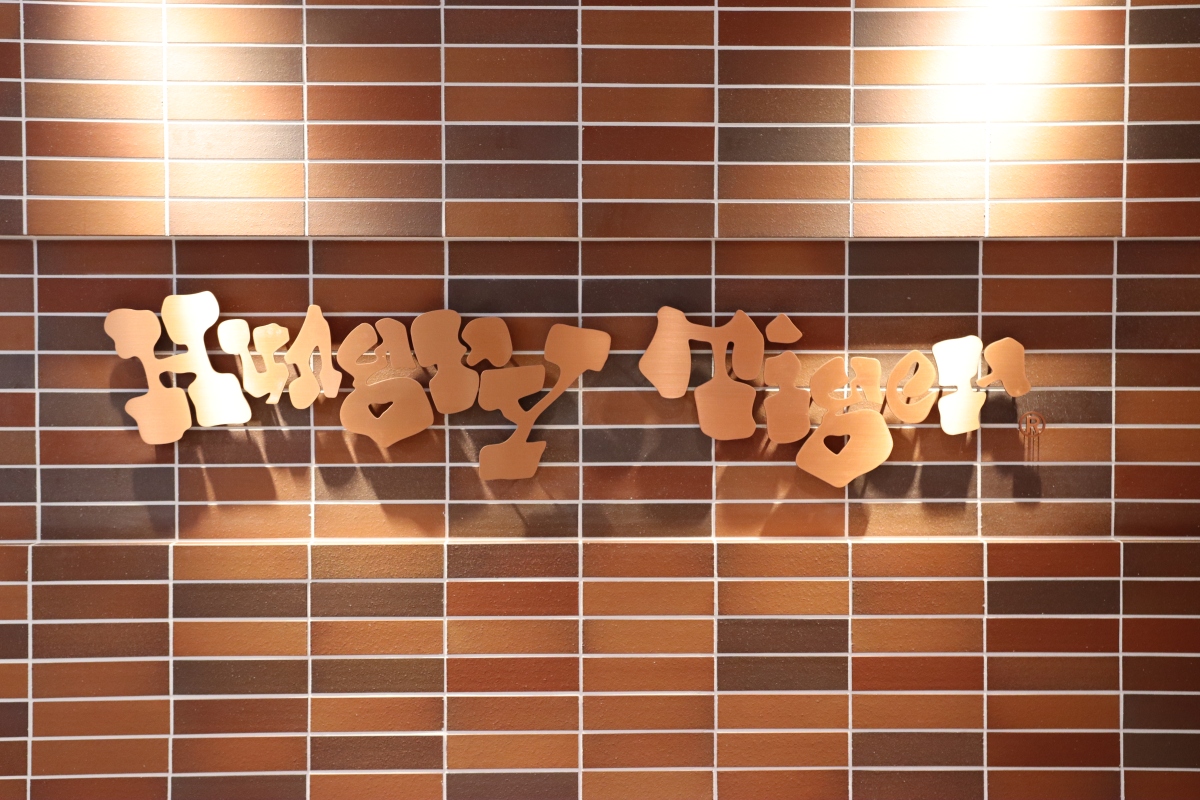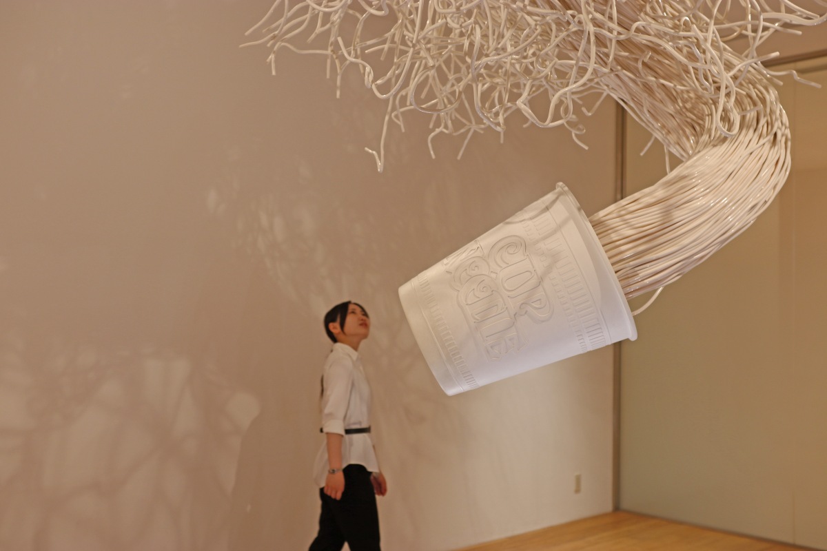 こちらは「タテ・ヨコ・ナナメから見る」を体現したオブジェ。麺の部分に、「creative」など日清食品グループが大切にしている4つのキーワードが隠されています。