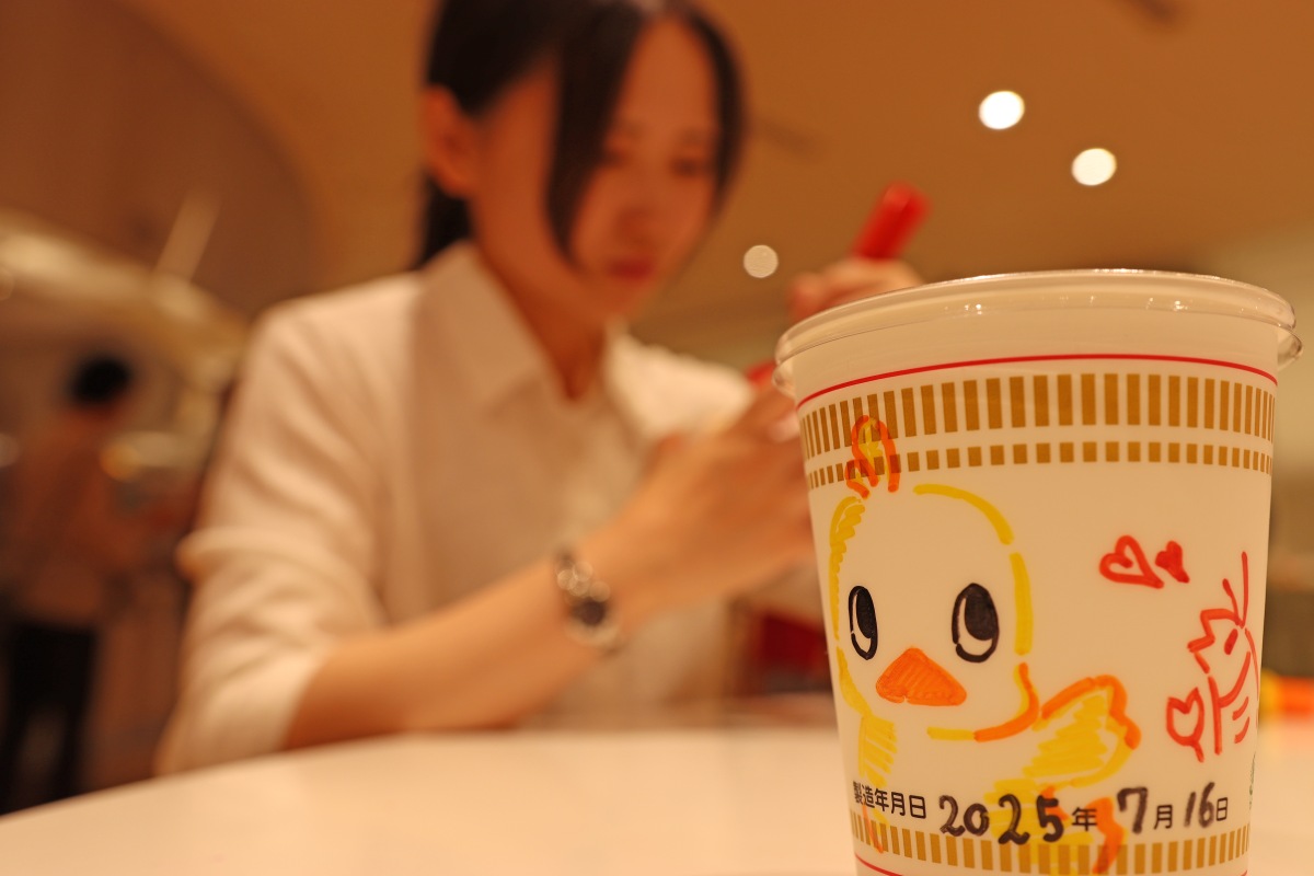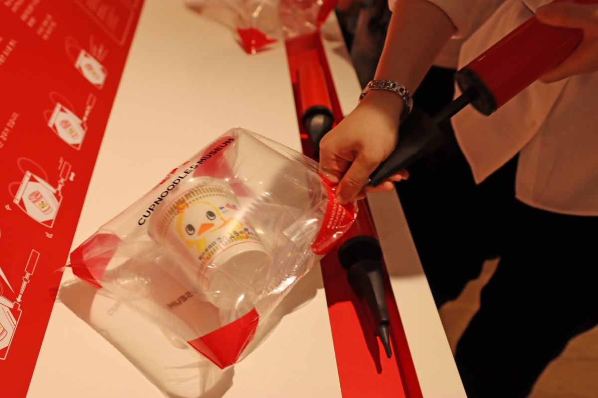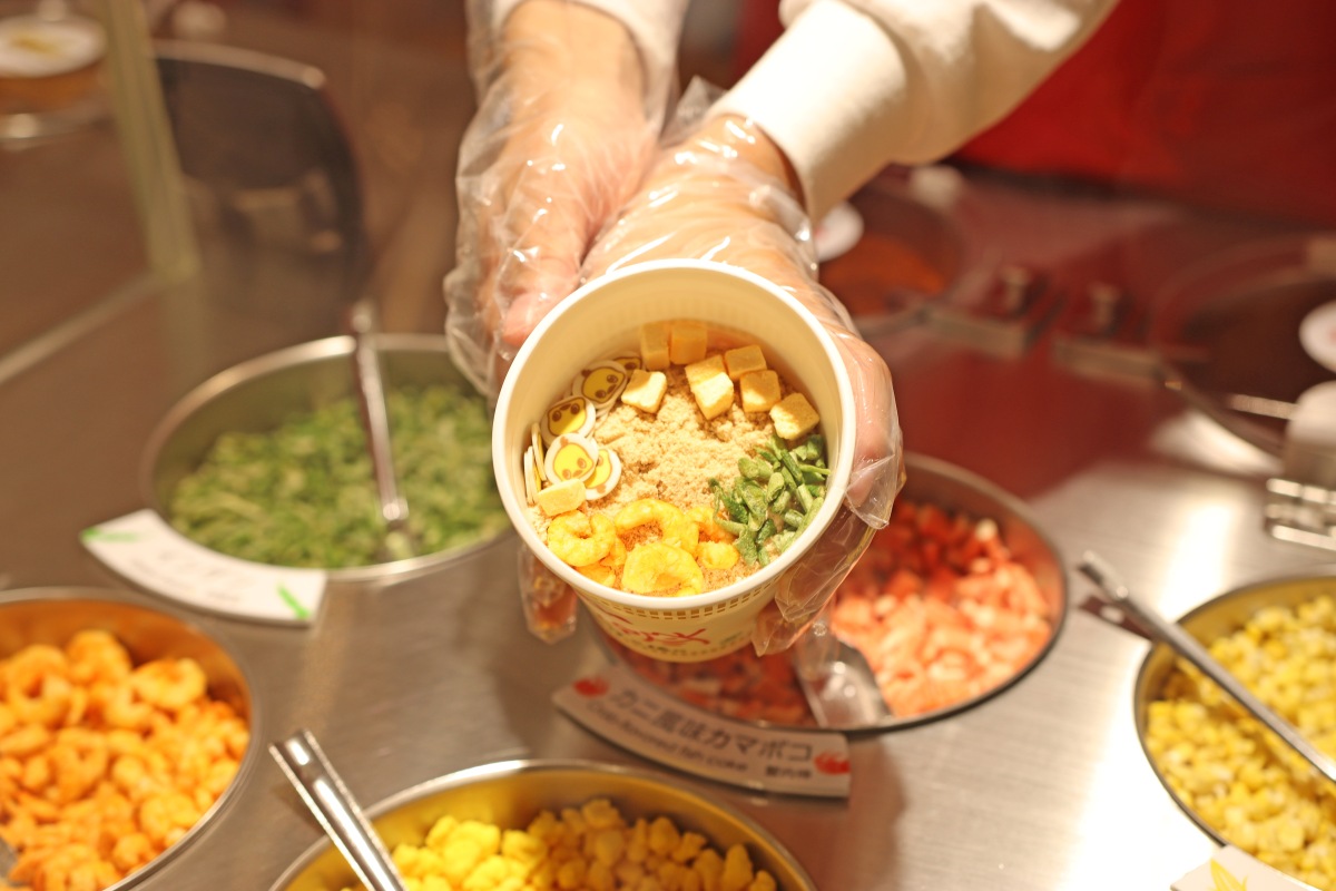 展示を楽しんだあとは「マイカップヌードルファクトリー」で、世界でひとつだけのオリジナル「カップヌードル」づくりに挑戦(1食500円、要整理券または利用券つき入館券)。自分でカップをデザインしたあと、スープを4種類から1つ、具材を12種類から4つ選びます。味の組み合わせは合計5,460通りだというから驚きです!