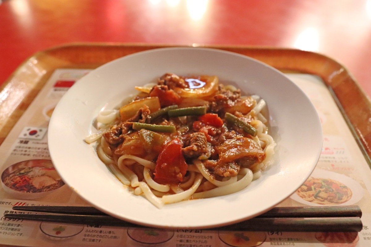 こちらはカザフスタンのラグマン。柔らかいうどんのような麺に、羊肉と野菜をトッピング。オイスターソースが隠し味になっています。