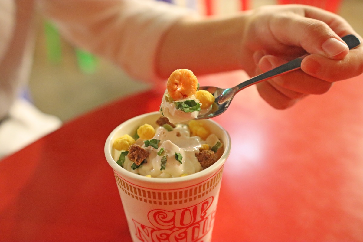 ここでしか食べられないという「カップヌードル ソフトクリーム(400円)」は、なんと「カップヌードル」の味を絶妙なバランスで表現したしょうゆ風味のソフトクリーム。「カップヌードル」と同じ具材がそのままトッピングされています。どんなお味か興味津々でしたが、想像以上に美味しい!甘じょっぱさがクセになります。
