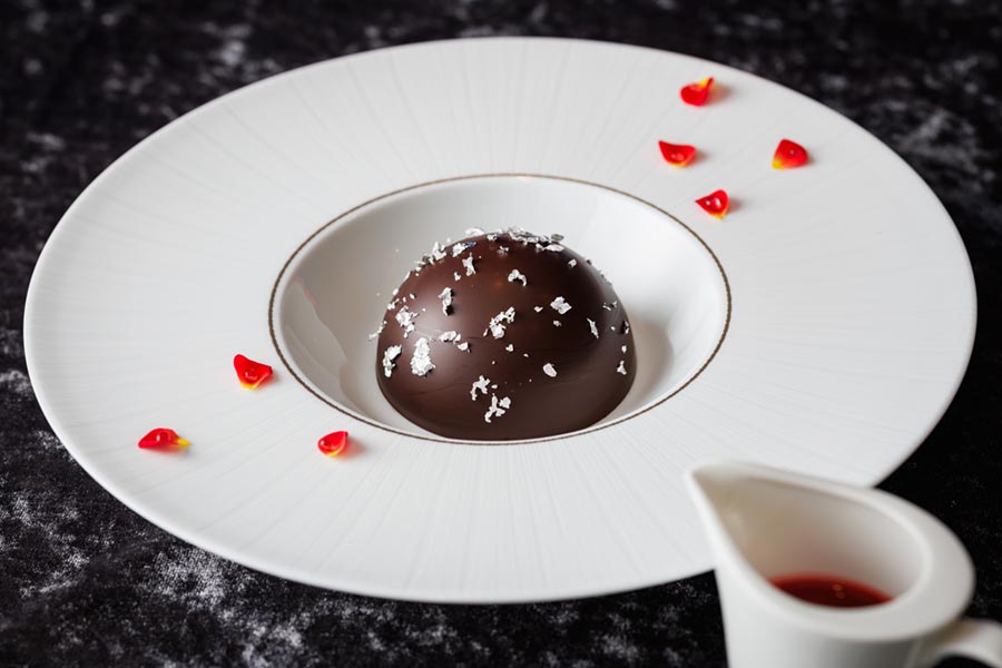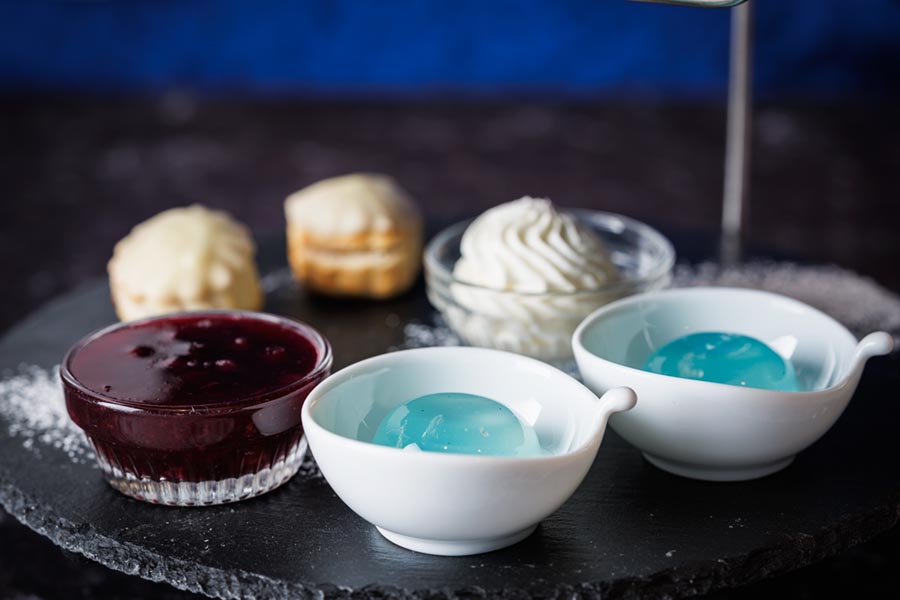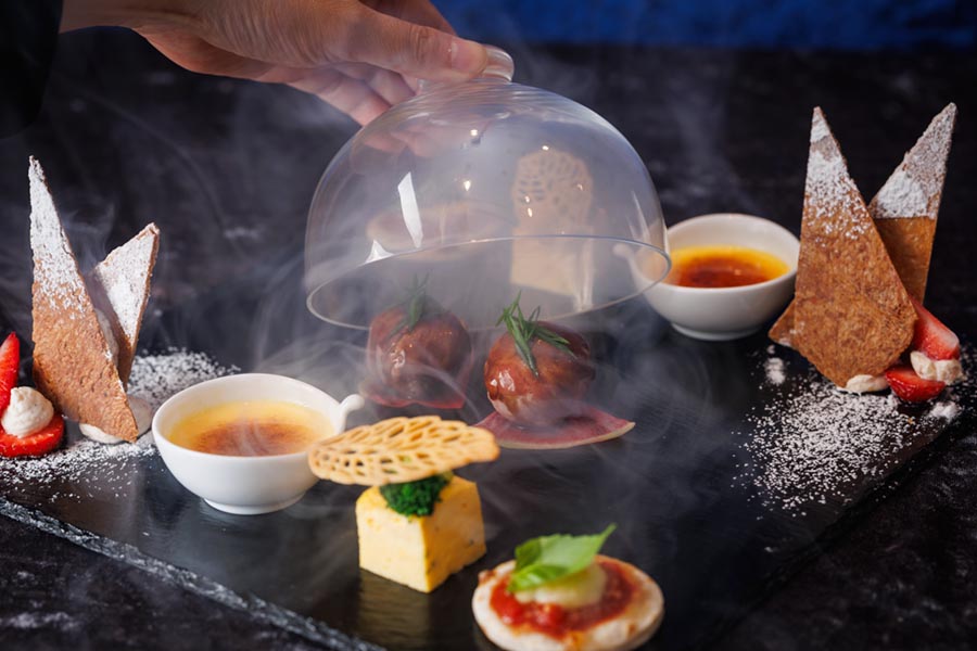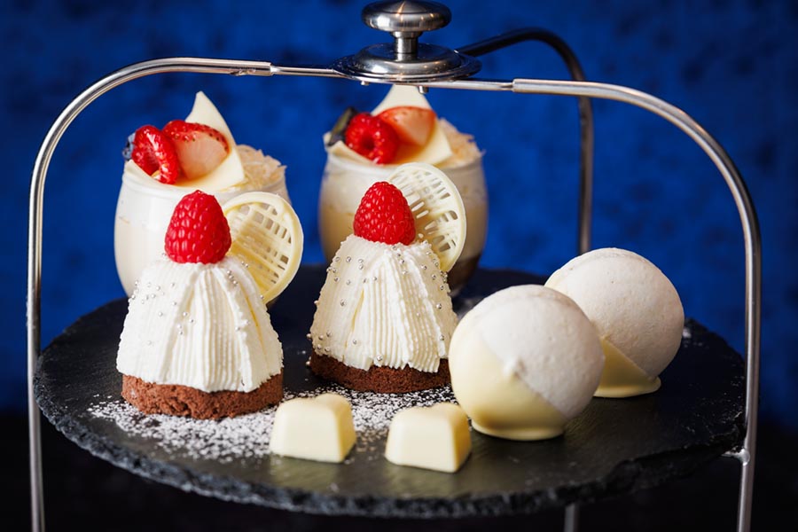 ティースタンドには、雪のように繊細なスイーツの数々が並びます。セイボリーは、旬の食材を贅沢に盛り込みました。ミニパフェ「林檎のクリスタルドーム」は、フレーバーを閉じ込めたバブルが弾けた瞬間、心地よい香りが静かに広がります。「ベリーソースが織りなすショコラドーム」は、温かなベリーソースがショコラドームを溶かし、内側のフルーツやバニラアイスとのマリアージュをお楽しみいただけます。