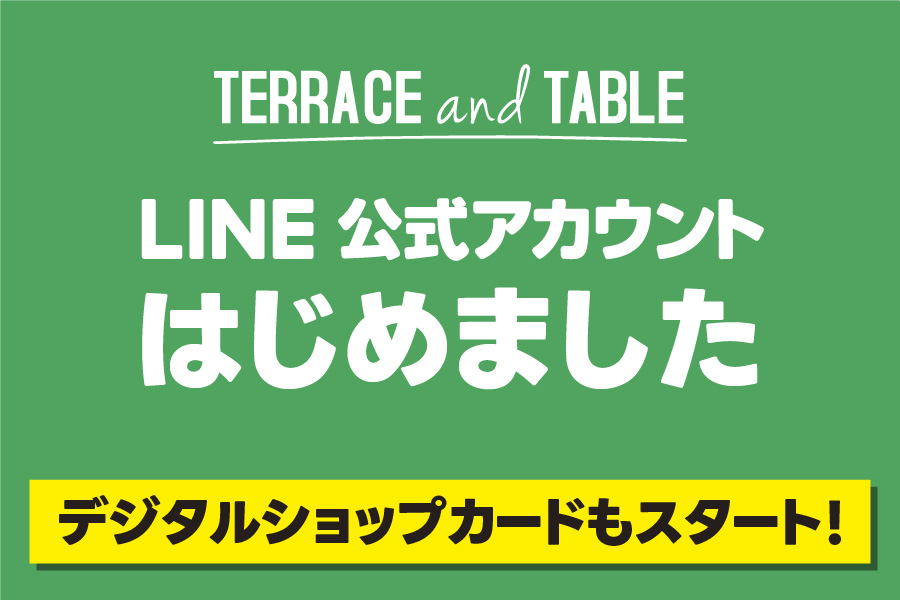 Terrace and TableのLINE公式アカウントを開設しました。LINEにて友だちになっていただくと、開催中のキャンペーン情報などをお知らせいたします。