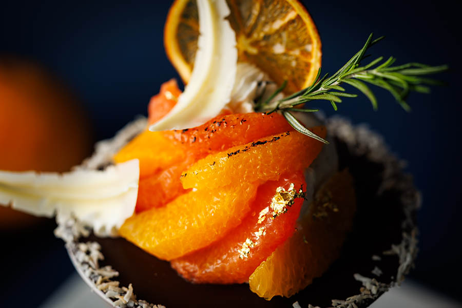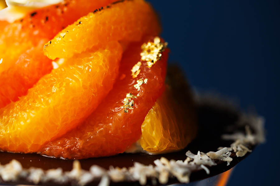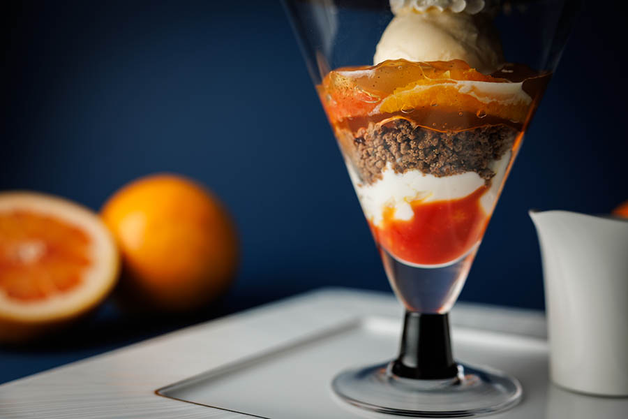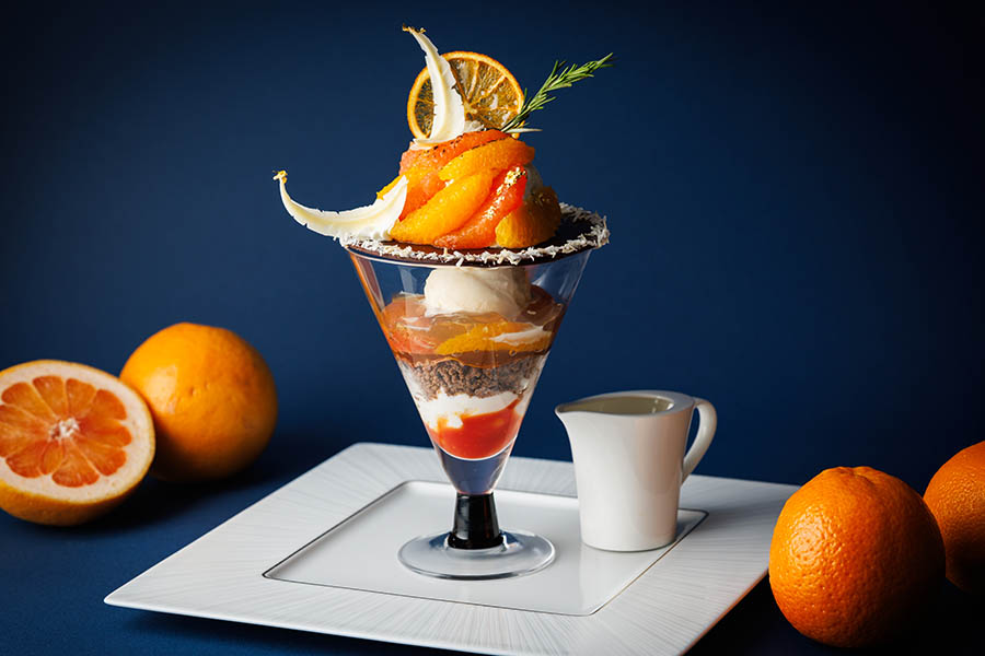 今が旬の柑橘を贅沢に使用した、春の訪れを告げるパフェ。素材の持ち味を活かすのはもちろん、香ばしいキャラメリゼや、ローズマリーと白ワインが華やかに香るコンポートなど、パティシエの技法により柑橘の魅力を多角的に引き出しました。