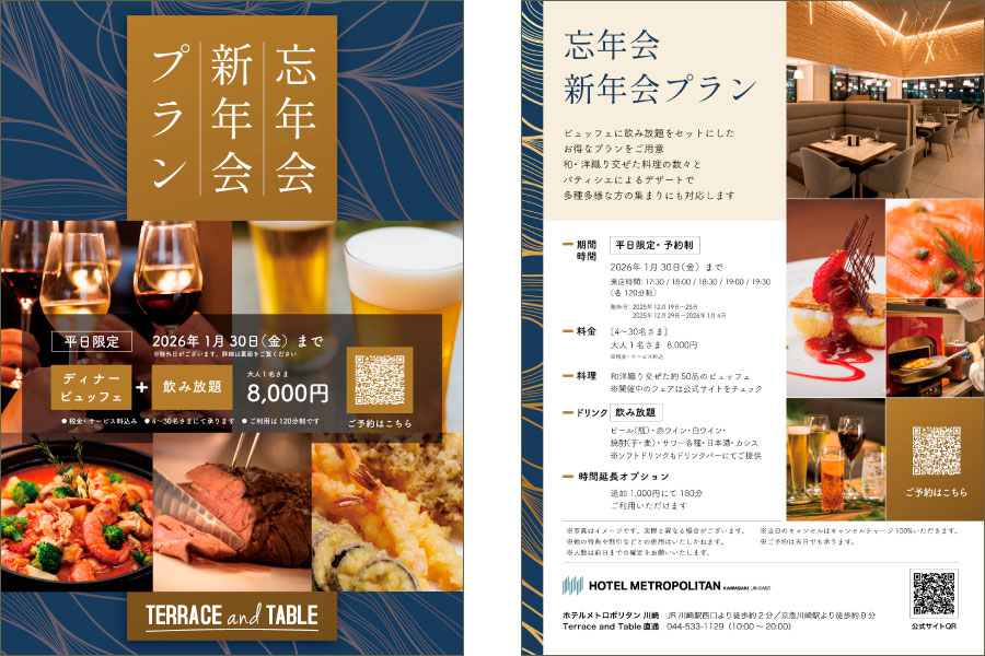 ホテルならではの一品一品にこだわった、和・洋織り交ぜた料理の数々とパティシエによるデザートと本プラン限定の飲み放題をセットにした、忘年会・新年会におすすめのパーティープランです。