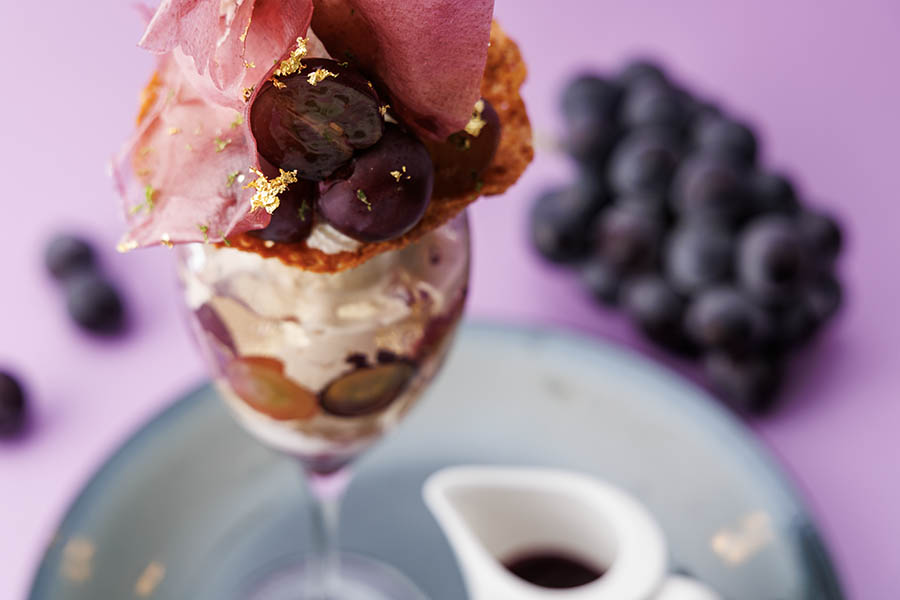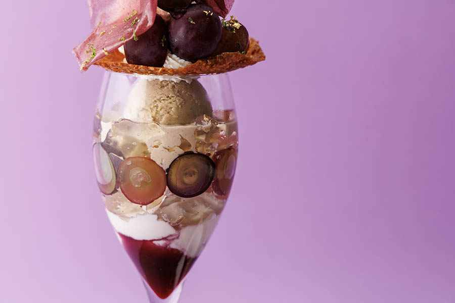 グラスの上には艶やかな巨峰とともに、煌びやかな金箔をあしらい、見た目にも華やかで特別感あふれる一品に仕上げます。甘味・酸味・スパイスの香りが折り重なり、最後のひと口まで飽きることなくお楽しみいただけます。