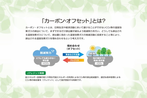 日常生活や経済活動において避けることができないCO₂等の温室効果ガスの排出について、まずできるだけ排出量が減るよう削減努力を行い、どうしても排出される温室効果ガスについて、排出量に見合った温室効果ガスの削減活動に投資すること等により、排出される温室効果ガスを埋め合わせるという考え方です。