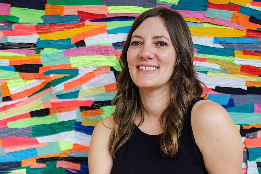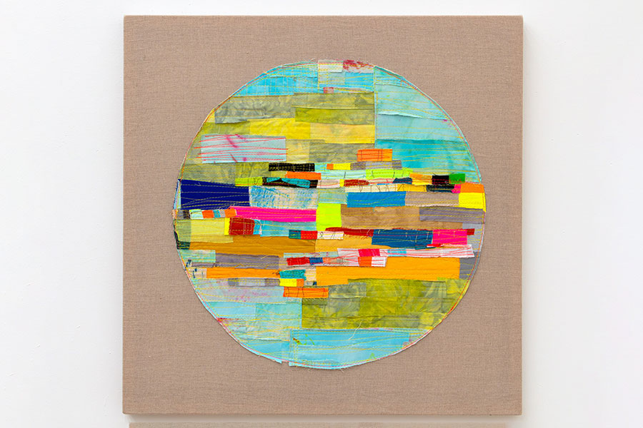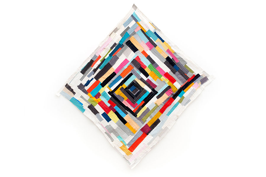 私は、布を解体し、ペイントし、染色することで、新たなカラーフィールドを作り出します。縫製、裁断、パッチワークといった工芸的な工程を積み重ね、大規模な「ジェスチャー・キルト制作」のパノラマを作り上げます。ミシンはドローイング・ツールとして機能し、柔らかな表面に蛇行するカラフルな線を描きます。それは、私の生きた経験を可鍛性のあるモザイク画に織り込む、プロセスに基づいた瞑想です。